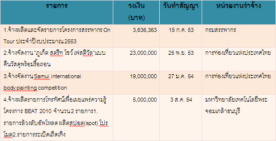 จากการตรวจสอบพบว่าในช่วงปี 2553-2554 บริษัทเวิร์คพอยท์ได้รับว่าจ้างจากหน่วยงานรัฐให้จัดอีเวนต์งานแสดงต่างๆประมาณ 50 ล้านบาท (ดูตาราง)