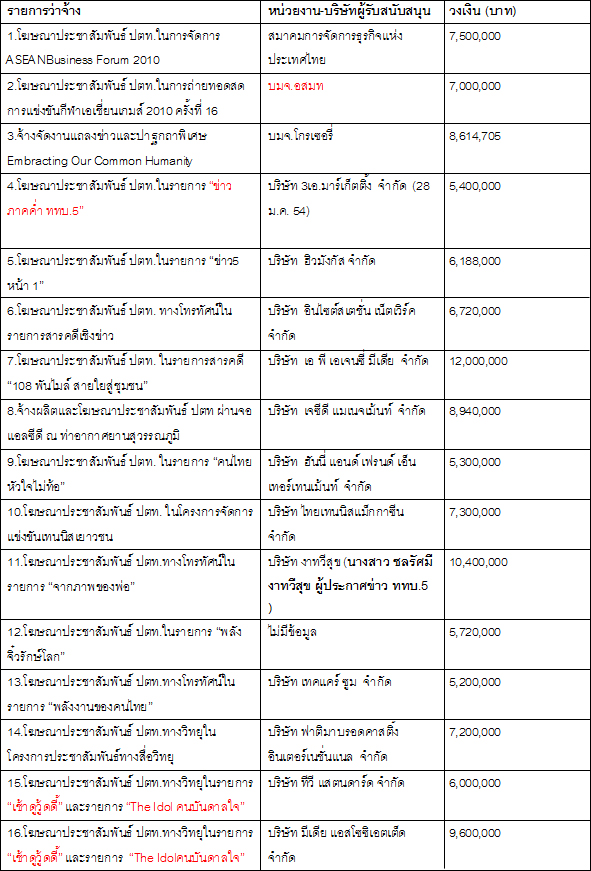 สำนักข่าวอิศรา (www.isranews.org) ตรวจสอบพบว่า ในรอบปีงบประมาณ 2554 (1 ต.ค.2553-30 ก.ย.2554) บริษัท ปตท.จำกัด  (มหาชน) รัฐวิสาหกิจ สังกัดกระทรวงพลังงาน ใช้งบประมาณในการว่าจ้างหน่วยงาน องค์กรเอกชน ประชาสัมพันธ์โครงการและกิจกรรมต่างๆถึง 44 รายการ วงเงินรวม 651,119,969 บาท   (ดูตาราง)