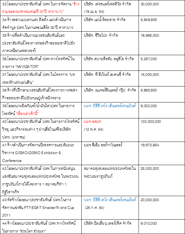 1.บมจ.อสมท  จำนวน  107 ล้านบาท ได้แก่  จ้างโฆษณาประชาสัมพันธ์ ปตท.ในการถ่ายทอดสดการแข่งขันกีฬาเอเชี่ยนเกมส์ 2010 ครั้งที่ 16   วงเงิน 7,000,000  บาท  (15 ธ.ค. 53) และ จ้างโฆษณาประชาสัมพันธ์ ปตท.ในรายการโทรทัศน์วิทยุ และกิจกรรมต่าง ๆ ผ่านสื่อในเครือบริษัท ปตท. (มหาชน) วงเงิน 100,000,000 บาท (12 พ.ค. 54)