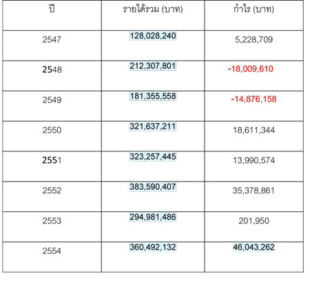 โดยปี 2547 แจ้งว่ามีรายได้ 128,028,240 บาท , ปี 2548 แจ้งว่ามีรายได้ 212,307,801 บาท ปี 2549 แจ้งว่ามีรายได้ 181,355,558 บาท , ปี 2550 แจ้งว่ามีรายได้ 321,637,211 บาท , ปี 2551 แจ้งว่ามีรายได้ 323,257,445 บาท ,ปี 2552 แจ้งว่ามีรายได้ 383,590,407 บาท , ปี 2553 แจ้งว่ามีรายได้ 294,981,486 บาท ล่าสุดปี 2554 แจ้งว่ามีรายได้ 360,492,132 บาท