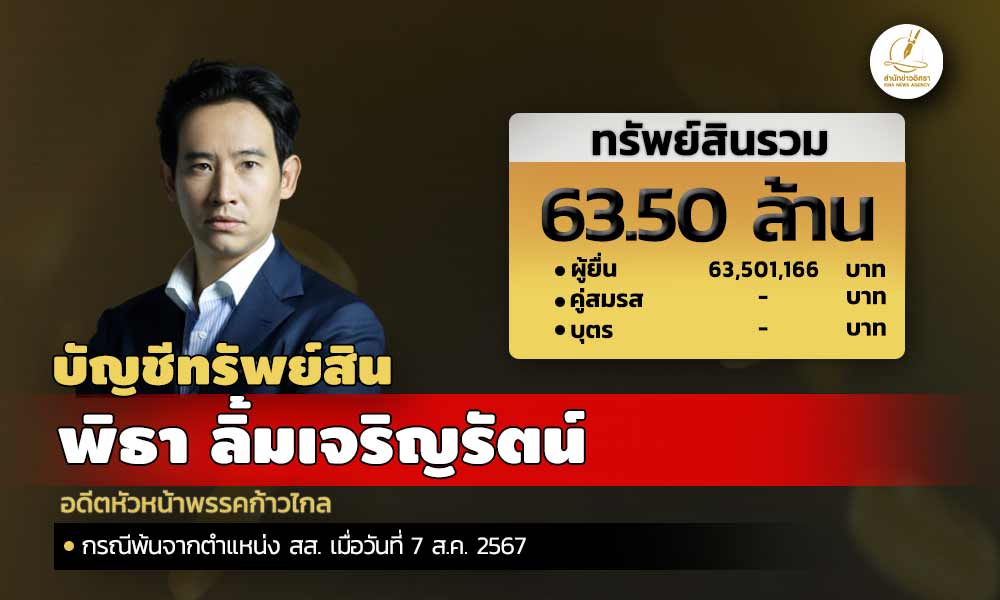 สำนักงานคณะกรรมการป้องกันและปราบปรามการทุจริตแห่งชาติ (ป.ป.ช.) เปิดเผยบัญชีแสดงทรัพย์สินและหนี้สินของ พิธา ลิ้มเจริญรัตน์ อดีตหัวหน้าพรรคก้าวไกล ทรัพย์สินทั้งหมด 63.50 ล. ได้แก่ เงินสด มูลค่า 1.80 ล. เงินฝาก 15 บัญชี มูลค่ารวม 2.19 ล. ที่ดิน 2 แปลง มูลค่ารวม 11.77 ล.ผู้ยื่นแจ้งมีรายได้ต่อปี 4.23 ล.
