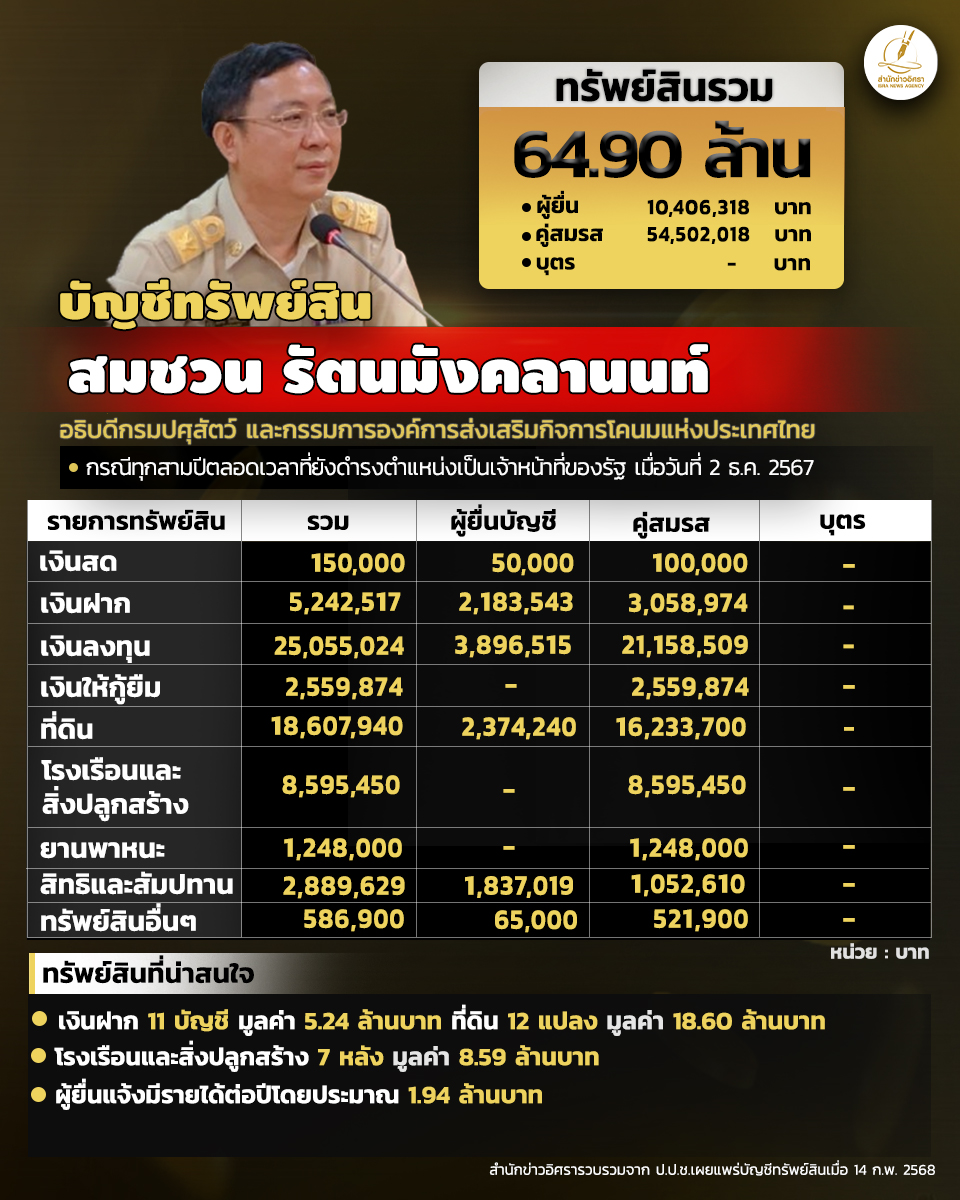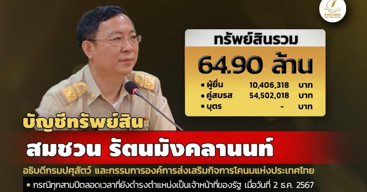 สำนักงานคณะกรรมการป้องกันและปราบปรามการทุจริตแห่งชาติ (ป.ป.ช.) เปิดเผยบัญชีแสดงทรัพย์สินและหนี้สินของ สมชวน รัตนมังคลานนท์ อธิบดีกรมปศุสัตว์ และกรรมการองค์การส่งเสริมกิจการโคนมแห่งประเทศไทย ทรัพย์สิน 64.90 ล. ประกอบด้วย เงินฝาก 11 บัญชี มูลค่า 5.24 ล. ที่ดิน 12 แปลง มูลค่า 18.60 ล. โรงเรือนและสิ่งปลูกสร้าง 7 หลัง มูลค่า 8.59 ล. ผู้ยื่นแจ้งมีรายได้ต่อปีโดยประมาณ 1.94 ล.