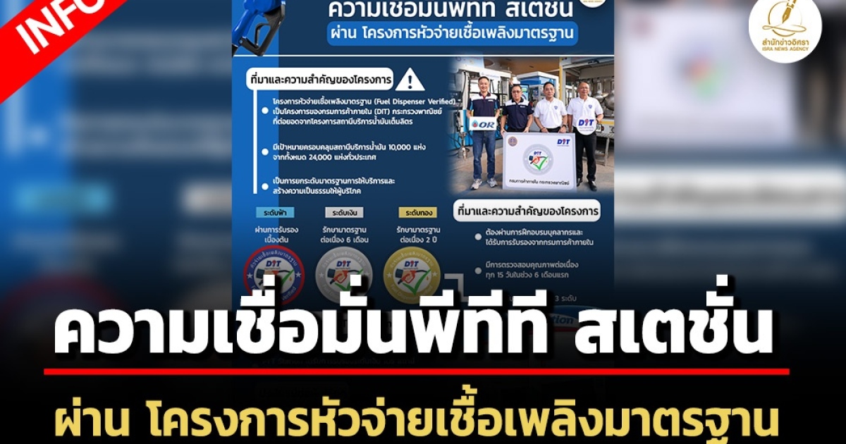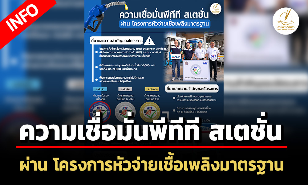 พีทีที สเตชั่น เข้าร่วมโครงการ "หัวจ่ายเชื้อเพลิงมาตรฐาน" จากกรมการค้าภายในครบ 100% ได้รับการรับรองระดับสีเงินมากที่สุดในประเทศ ตอกย้ำความเข้มข้นในการรักษามาตรฐานการให้บริการ “มั่นใจ เต็มลิตร ทุกปั๊ม”