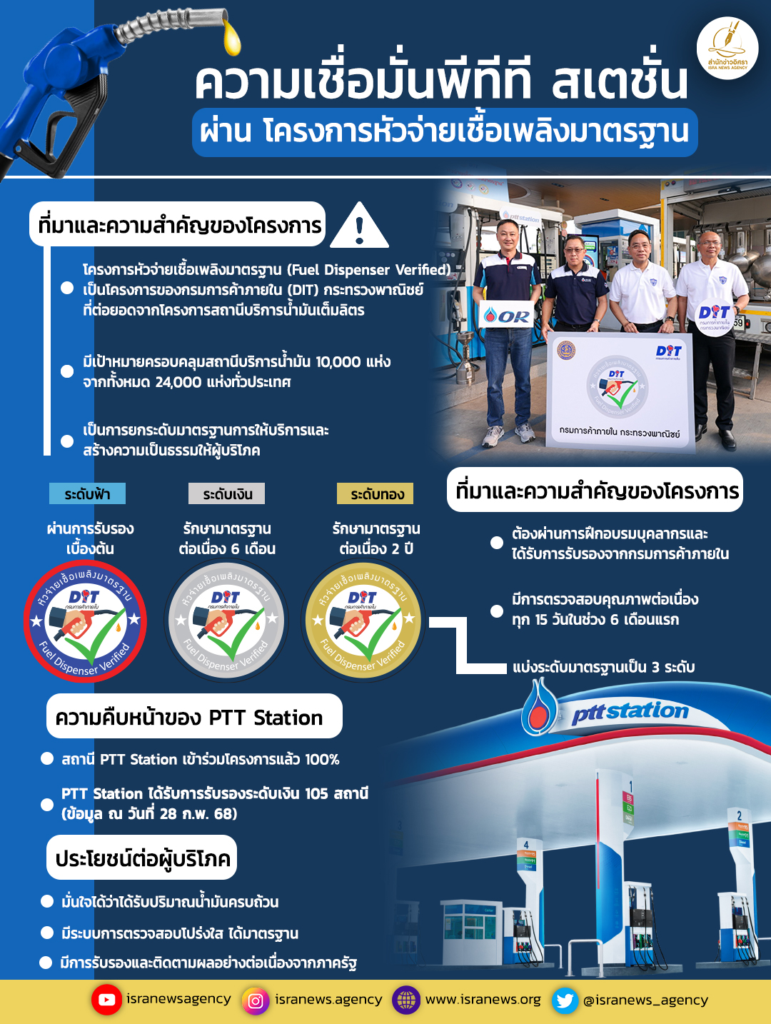 หม่อมหลวงปีกทอง ทองใหญ่ ประธานเจ้าหน้าที่บริหาร บริษัท ปตท. น้ำมันและการค้าปลีก จำกัด (มหาชน) หรือ OR กล่าวว่า การเข้าร่วม "โครงการหัวจ่ายเชื้อเพลิงมาตรฐาน” ของกรมการค้าภายใน สอดคล้องกับแนวทางการดำเนินงานและความตั้งใจของ OR ที่ให้ความสำคัญกับการรักษามาตรฐานการให้บริการของ พีทีที สเตชั่น มาอย่างต่อเนื่องให้เข้มข้นมากยิ่งขึ้น และเป็นตัวอย่างที่สำคัญที่สะท้อนให้เห็นถึงศักยภาพและความมุ่งมั่นของ OR ในการส่งมอบประสบการณ์ที่ดีที่สุด และตอกย้ำความมั่นใจให้แก่ผู้บริโภคว่าจะได้รับปริมาณน้ำมันเป็นไปตามมาตรฐานทุกหัวจ่ายตามที่กรมการค้าภายในกำหนด โดยปัจจุบัน สถานีบริการ พีทีที สเตชั่น ทุกแห่งทั่วประเทศจำนวน 2,184 สถานี ได้สมัครเข้าร่วมโครงการครบถ้วนทั้งหมด 100% แล้ว โดยมีสถานีบริการ พีทีที สเตชั่น ที่ได้รับการอนุมัติให้ผ่านการรับรองแล้ว 2,014 สถานี ส่วนที่เหลืออยู่ระหว่างดำเนินการและรออนุมัติ และยังมีสถานีบริการ พีทีที สเตชั่น ที่ได้รับการรับรองระดับสีเงิน ซึ่งเป็นสถานีบริการที่รักษามาตรฐานอย่างต่อเนื่องเป็นเวลา 6 เดือน จำนวน 105 สถานี (ข้อมูล ณ วันที่ 28 ก.พ. 68) แห่ง และอยู่ระหว่างการการมุ่งสู่การรับรองระดับสูงสุดคือระดับสีทองที่ต้องรักษามาตรฐานต่อเนื่องเป็นเวลา 2 ปี อีกด้วย