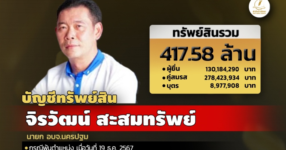 สำนักงานคณะกรรมการป้องกันและปราบปรามการทุจริตแห่งชาติ (ป.ป.ช.) เปิดเผยบัญชีแสดงทรัพย์สินและหนี้สินของ จิรวัฒน์ สะสมทรัพย์ นายก อบจ.นครปฐม ทรัพย์สิน 417.58 ล. ประกอบด้วย เงินสด มูลค่า 400,000 บาท เงินฝาก 41 บัญชี มูลค่ารวม 28.33 ล. ที่ดิน 27 แปลง มูลค่ารวม 113.58 ล. ผู้ยื่นแจ้งมีรายได้ต่อปี 869,813 บาท