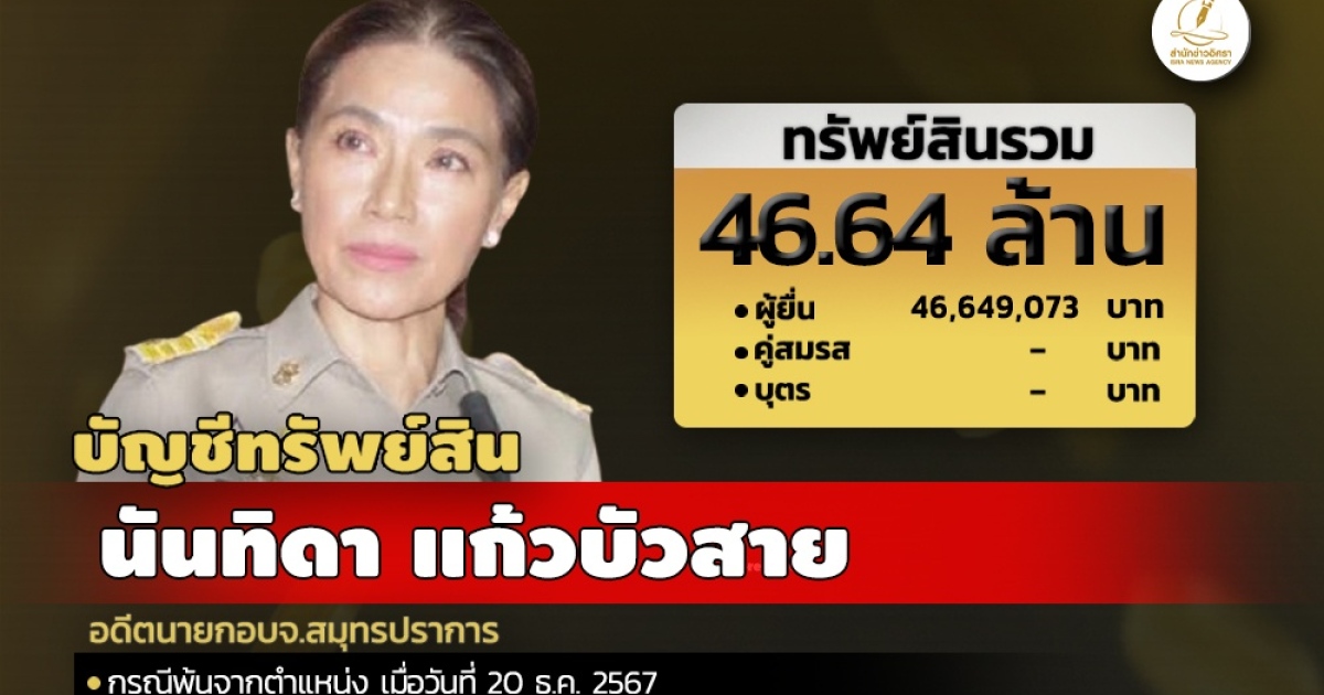 สำนักงานคณะกรรมการป้องกันและปราบปรามการทุจริตแห่งชาติ (ป.ป.ช.) เปิดเผยบัญชีแสดงทรัพย์สินและหนี้สินของ นันทิดา แก้วบัวสาย อดีตนายกอบจ.สมุทรปราการ ทรัพย์สิน 46.64 ล. ประกอบด้วย เงินฝาก 6 บัญชี มูลค่ารวม 2.63 ล. ที่ดิน 2 แปลง มูลค่ารวม 24.31 ล. ผู้ยื่นแจ้งมีรายได้ต่อปี 4.03 ล.