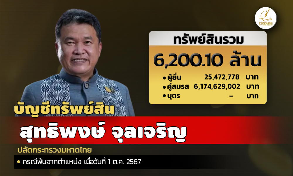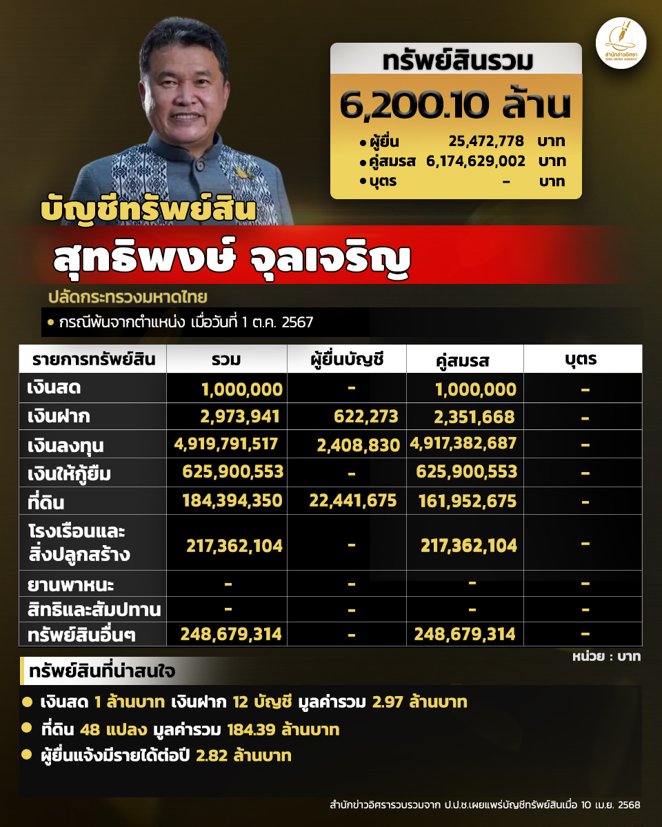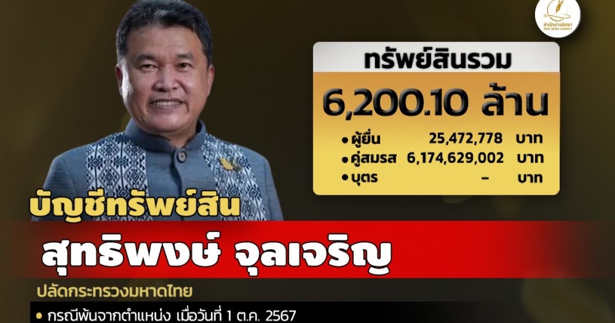 สำนักงานคณะกรรมการป้องกันและปราบปรามการทุจริตแห่งชาติ (ป.ป.ช.) เปิดเผยบัญชีแสดงทรัพย์สินและหนี้สินของ สุทธิพงษ์ จุลเจริญ ปลัดกระทรวงมหาดไทย ทรัพย์สิน 6,200.10 ล. ประกอบด้วย เงินสด 1 ล. เงินฝาก 12 บัญชี มูลค่ารวม 2.97 ล. ที่ดิน 48 แปลง มูลค่ารวม 184.39 ล. ผู้ยื่นแจ้งมีรายได้ต่อปี 2.82 ล.