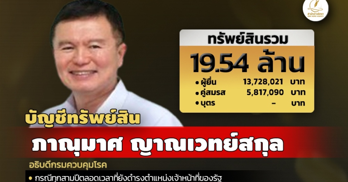 สำนักงานคณะกรรมการป้องกันและปราบปรามการทุจริตแห่งชาติ (ป.ป.ช.) เปิดเผยบัญชีแสดงทรัพย์สินและหนี้สินของ ภาณุมาศ ญาณเวทย์สกุล อธิบดีกรมควบคุมโรค ทรัพย์สิน 19.54 ล. ประกอบด้วย เงินฝาก 15 บัญชี มูลค่ารวม 2.35 ล. ที่ดิน 5 แปลง มูลค่ารวม 4.80 ล. ผู้ยื่นแจ้งมีรายได้ต่อปี 1.26 ล.