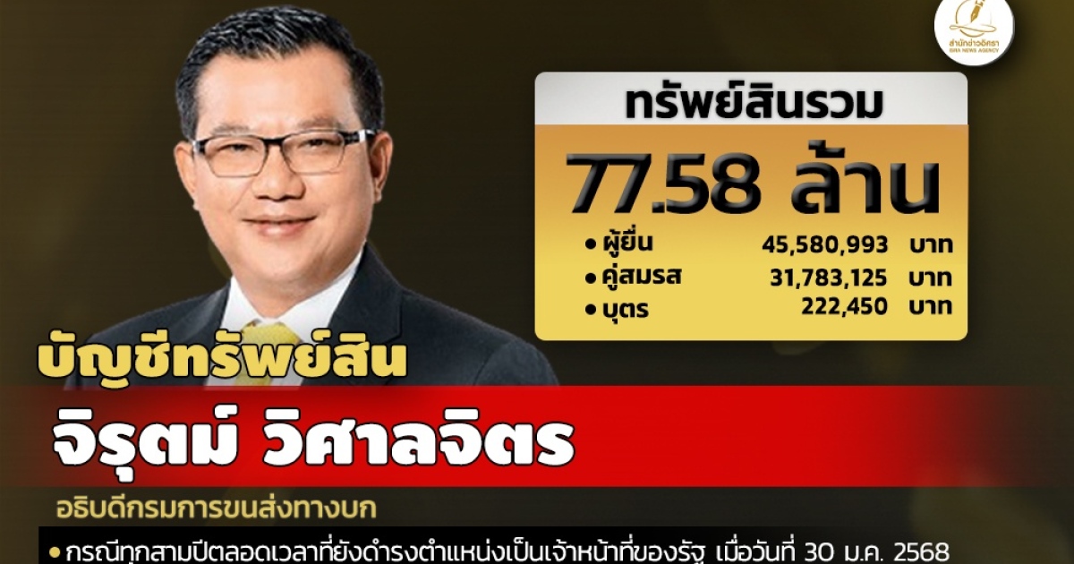 สำนักงานคณะกรรมการป้องกันและปราบปรามการทุจริตแห่งชาติ (ป.ป.ช.) เปิดเผยบัญชีแสดงทรัพย์สินและหนี้สินของ จิรุตม์ วิศาลจิตร อธิบดีกรมการขนส่งทางบก ทรัพย์สิน 77.58 ล. ประกอบด้วย เงินฝาก 29 บัญชี มูลค่ารวม 20.06 ล. ที่ดิน 7 แปลง มูลค่ารวม 10.46 ล. โรงเรือนและสิ่งปลูกสร้าง 5 หลัง มูลค่ารวม 12.08 ล. ผู้ยื่นแจ้งมีรายได้ต่อปี 5.01 ล.