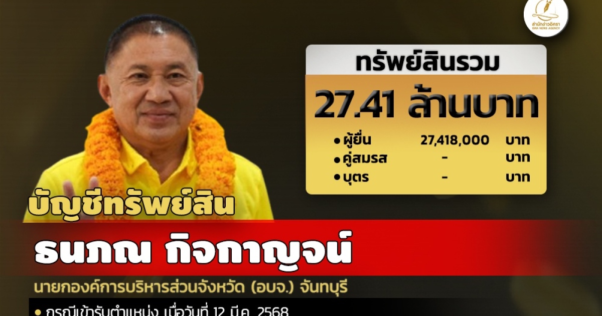 สำนักงานคณะกรรมการป้องกันและปราบปรามการทุจริตแห่งชาติ (ป.ป.ช.) เปิดเผยบัญชีแสดงทรัพย์สินและหนี้สินของ ธนภณ กิจกาญจน์ นายกองค์การบริหารส่วนจังหวัด (อบจ.) จันทบุรี ทรัพย์สิน 27.41 ล. ประกอบด้วย ที่ดิน 2 แปลง มูลค่า 22.22 ล. โรงเรือนและสิ่งปลูกสร้าง 1 หลัง มูลค่า 1.50 ล. ผู้ยื่นแจ้งมีรายได้ต่อปี 877,122 บาท