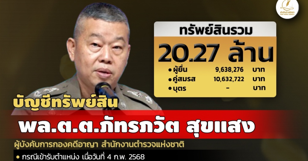 สำนักงานคณะกรรมการป้องกันและปราบปรามการทุจริตแห่งชาติ (ป.ป.ช.) เปิดเผยบัญชีแสดงทรัพย์สินและหนี้สินของ พล.ต.ต.ภัทรภวัต สุขแสง ผู้บังคับการกองคดีอาญา สำนักงานตำรวจแห่งชาติ ทรัพย์สิน 20.27 ล. ประกอบด้วย เงินฝาก 4 บัญชี มูลค่ารวม 2.05 ล. ที่ดิน 3 แปลง มูลค่ารวม 9.50 ล. โรงเรือนและสิ่งปลูกสร้าง 1 หลัง มูลค่า 3.50 ล. ผู้ยื่น แจ้งมีรายได้ต่อปีโดยประมาณ 1.31 ล.
