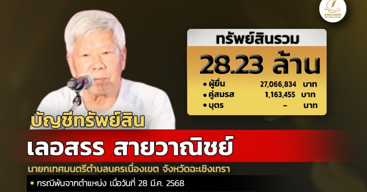 สำนักงานคณะกรรมการป้องกันและปราบปรามการทุจริตแห่งชาติ (ป.ป.ช.) เปิดเผยบัญชีแสดงทรัพย์สินและหนี้สินของ เลอสรร สายวาณิชย์ นายกเทศมนตรีตำบลนครเนื่องเขต จังหวัดฉะเชิงเทรา ทรัพย์สิน 28.23 ล. ประกอบด้วย เงินฝาก 14 บัญชี มูลค่า 2.92 ล. ที่ดิน 2 แปลง มูลค่ารวม 20.03 ล.โรงเรือนและสิ่งปลูกสร้าง 2 หลัง มูลค่ารวม 3.50 ล. ผู้ยื่นแจ้งมีรายได้ต่อปี 484,800 บาท