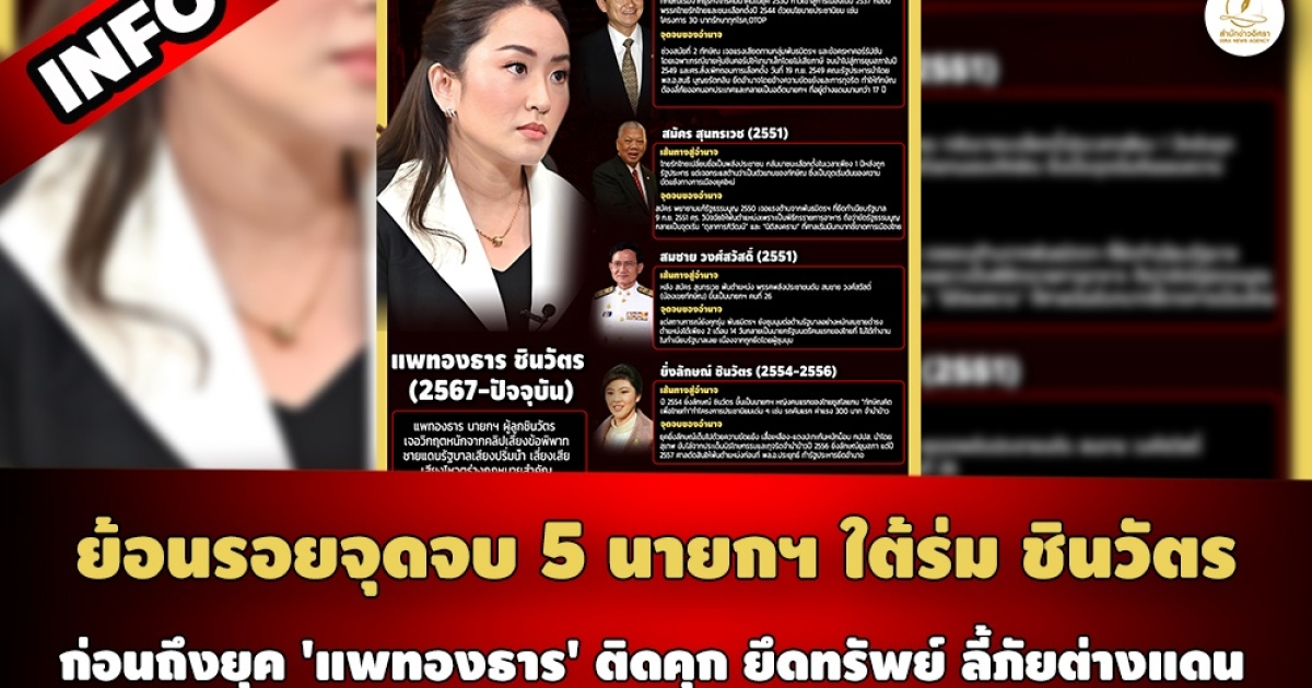 ย้อนรอยจุดจบ 5 นายกฯใต้ร่ม ‘ตระกูลชินวัตร’ ไล่เรียง ‘ทักษิณ-สมัคร-สมชาย-ยิ่งลักษณ์-เศรษฐา’ หลังกระแสคลิปลับสะเทือนบัลลังก์นายกฯ ‘แพทองธาร’ สำนักข่าวอิศรา จึงนำข้อมูล มานำเสนอผ่านภาพอินโฟกราฟิก ดังนี้