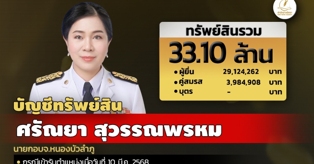 สำนักงานคณะกรรมการป้องกันและปราบปรามการทุจริตแห่งชาติ (ป.ป.ช.) เปิดเผยบัญชีแสดงทรัพย์สินและหนี้สินของ ศรัณยา สุวรรณพรหม นายกอบจ.หนองบัวลำภู ทรัพย์สิน 33.10 ล. ประกอบด้วย เงินฝาก 8 บัญชี มูลค่ารวม 56,421 บาท ที่ดิน 8 แปลง มูลค่ารวม 23 ล. โรงเรือนและสิ่งปลูกสร้าง 1 หลัง มูลค่า 5 ล. ผู้ยื่นแจ้งมีรายได้ต่อปี 906,360 บาท