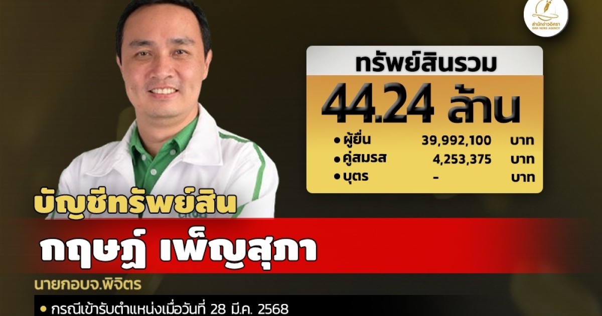 สำนักงานคณะกรรมการป้องกันและปราบปรามการทุจริตแห่งชาติ (ป.ป.ช.) เปิดเผยบัญชีแสดงทรัพย์สินและหนี้สินของ กฤษฏ์ เพ็ญสุภา นายกอบจ.พิจิตร ทรัพย์สิน 44.24 ล. ประกอบด้วย เงินฝาก 7 บัญชี มูลค่ารวม 365,229 บาท ผู้ยื่นแจ้งมีรายได้ต่อปี 906,360 บาท
