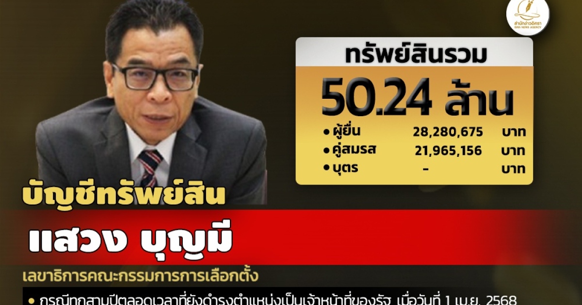 สำนักงานคณะกรรมการป้องกันและปราบปรามการทุจริตแห่งชาติ (ป.ป.ช.) เปิดเผยบัญชีแสดงทรัพย์สินและหนี้สินของ แสวง บุญมี เลขาธิการคณะกรรมการการเลือกตั้ง ทรัพย์สิน 50.24 ล. ประกอบด้วย เงินฝาก 13 บัญชี มูลค่ารวม 11.05 ล. ที่ดิน 27 แปลง มูลค่ารวม 6.59 ล. โรงเรือนและสิ่งปลูกสร้าง 6 หลัง มูลค่ารวม 4.80 ล. ผู้ยื่น แจ้งมีรายได้ต่อปีโดยประมาณ 2.23 ล.