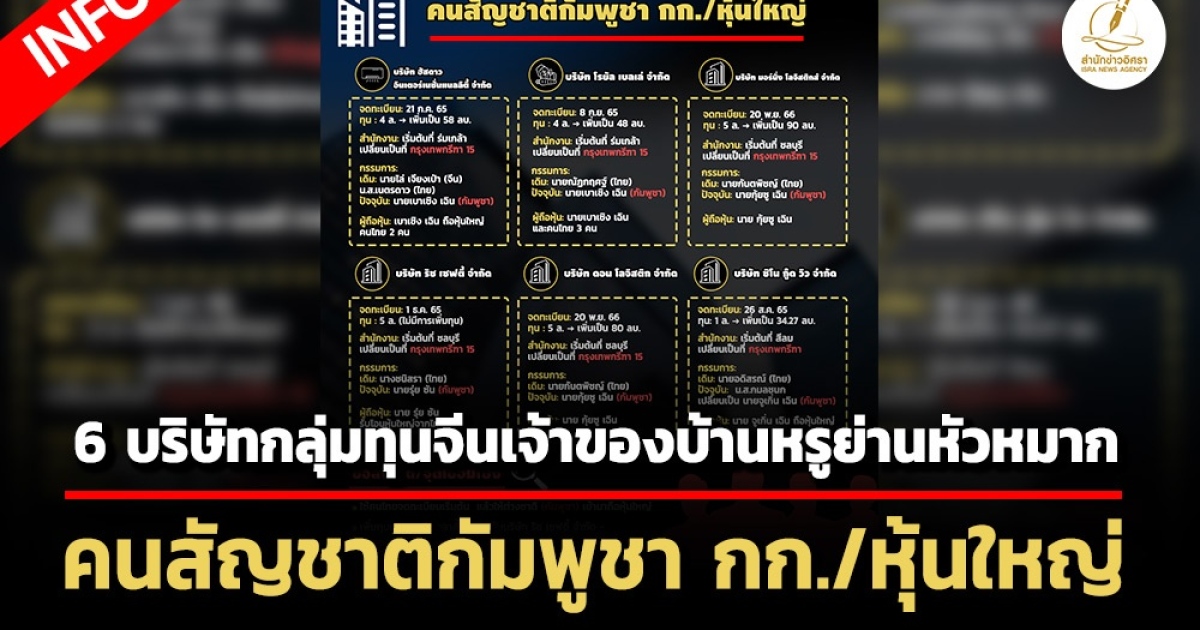 ล่าสุดสำนักข่าวอิศรารวบรวมบริษัทกลุ่มทุนจีนเฉพาะรายที่มีบุคคลสัญชาติกัมพูชาเป็นกรรมการและหรือถือหุ้นใหญ่ จำนวน 6 บริษัท ได้แก่ บริษัท ฮัสดาว อินเตอร์เนชั่นแนลลิตี้ จำกัด บริษัท โรยัล เบลเล่ จำกัด บริษัท ริช เซฟตี้ จำกัด บริษัท ดอน โลจิสติก จำกัด บริษัท มอร์นิ่ง โลจิสติกส์ จำกัด และบริษัท ซิโน กู๊ด วิว จำกัด จึงนำข้อมูล มานำเสนอผ่านภาพอินโฟกราฟิก ดังนี้