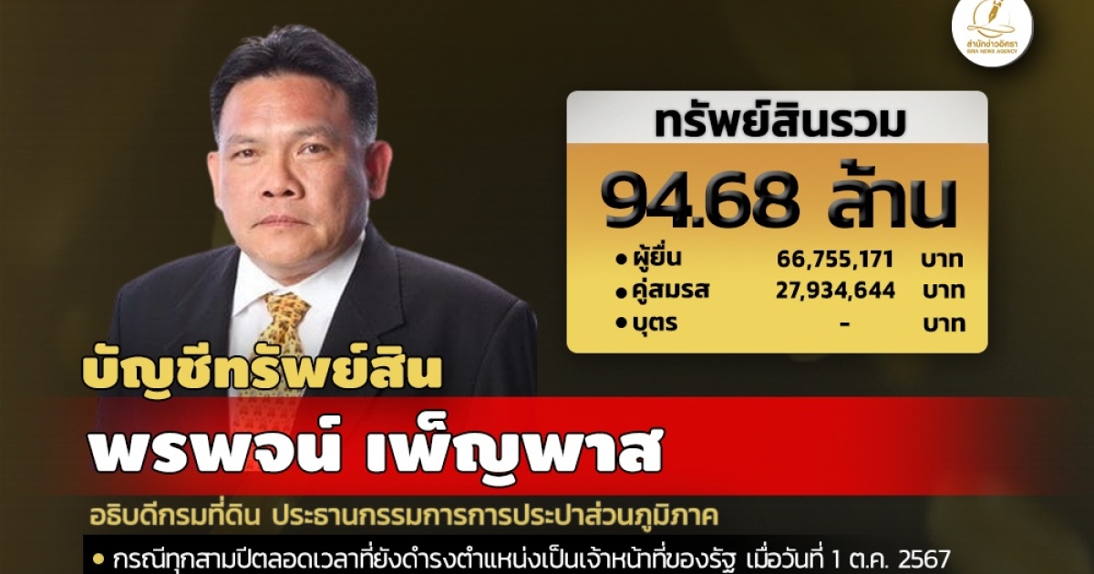 สำนักงานคณะกรรมการป้องกันและปราบปรามการทุจริตแห่งชาติ (ป.ป.ช.) เปิดเผยบัญชีแสดงทรัพย์สินและหนี้สินของ พรพจน์ เพ็ญพาส อธิบดีกรมที่ดิน ประธานกรรมการการประปาส่วนภูมิภาค และกรรมการการไฟฟ้าฝ่ายผลิตแห่งประเทศไทย ทรัพย์สิน 94.68 ล. ประกอบด้วย เงินฝาก 21 บัญชี มูลค่า 40.21 ล. ที่ดิน 4 แปลง มูลค่า 25.44 ล. โรงเรือนและสิ่งปลูกสร้าง 2 หลัง มูลค่า 11 ล. ผู้ยื่นแจ้งมีรายได้ต่อปี 3.38 ล.