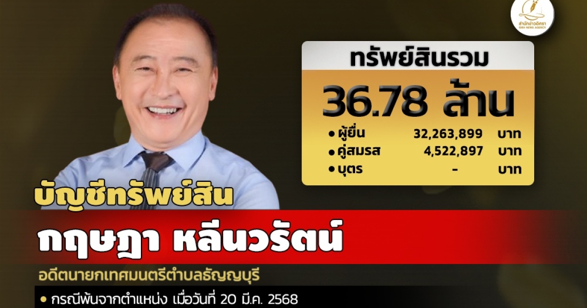 สำนักงานคณะกรรมการป้องกันและปราบปรามการทุจริตแห่งชาติ (ป.ป.ช.) เปิดเผยบัญชีแสดงทรัพย์สินและหนี้สินของ กฤษฎา หลีนวรัตน์ อดีตนายกเทศมนตรีตำบลธัญญบุรี ทรัพย์สิน 36.78 ล. ประกอบด้วย เงินฝาก 8 บัญชี มูลค่า 4.22 ล. ที่ดิน 13 แปลง มูลค่า 11.80 ล. โรงเรือนและสิ่งปลูกสร้าง 2 หลัง มูลค่า 11 ล.