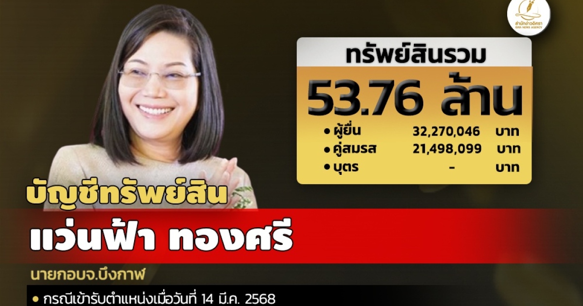สำนักงานคณะกรรมการป้องกันและปราบปรามการทุจริตแห่งชาติ (ป.ป.ช.) เปิดเผยบัญชีแสดงทรัพย์สินและหนี้สินของ แว่นฟ้า ทองศรี นายกอบจ.บึงกาฬ ทรัพย์สิน 53.76 ล. ประกอบด้วย เงินฝาก 5 บัญชี มูลค่า 3.65 ล. ที่ดิน 21 แปลง มูลค่า 31.94 ล. โรงเรือนและสิ่งปลูกสร้าง 5 หลัง มูลค่า 6.49 ล. ผู้ยื่น แจ้งมีรายได้ต่อปีโดยประมาณ 906,360 บาท