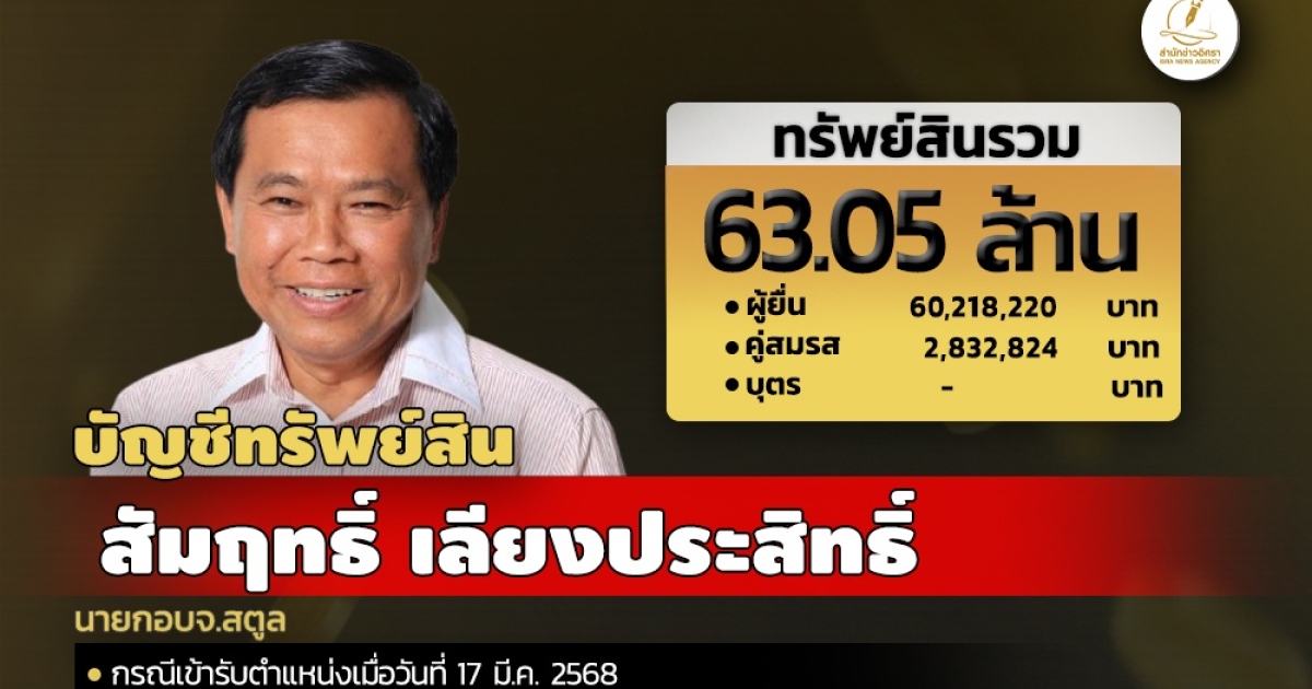 สำนักงานคณะกรรมการป้องกันและปราบปรามการทุจริตแห่งชาติ (ป.ป.ช.) เปิดเผยบัญชีแสดงทรัพย์สินและหนี้สินของ สัมฤทธิ์ เลียงประสิทธิ์ นายกอบจ.สตูล ทรัพย์สิน 63.05 ล. ประกอบด้วย เงินฝาก 17 บัญชี มูลค่ารวม 1.78 ล. ที่ดิน 34 แปลง มูลค่ารวม 58.55 ล. ผู้ยื่น แจ้งมีรายได้ต่อปีโดยประมาณ 1.05 ล.