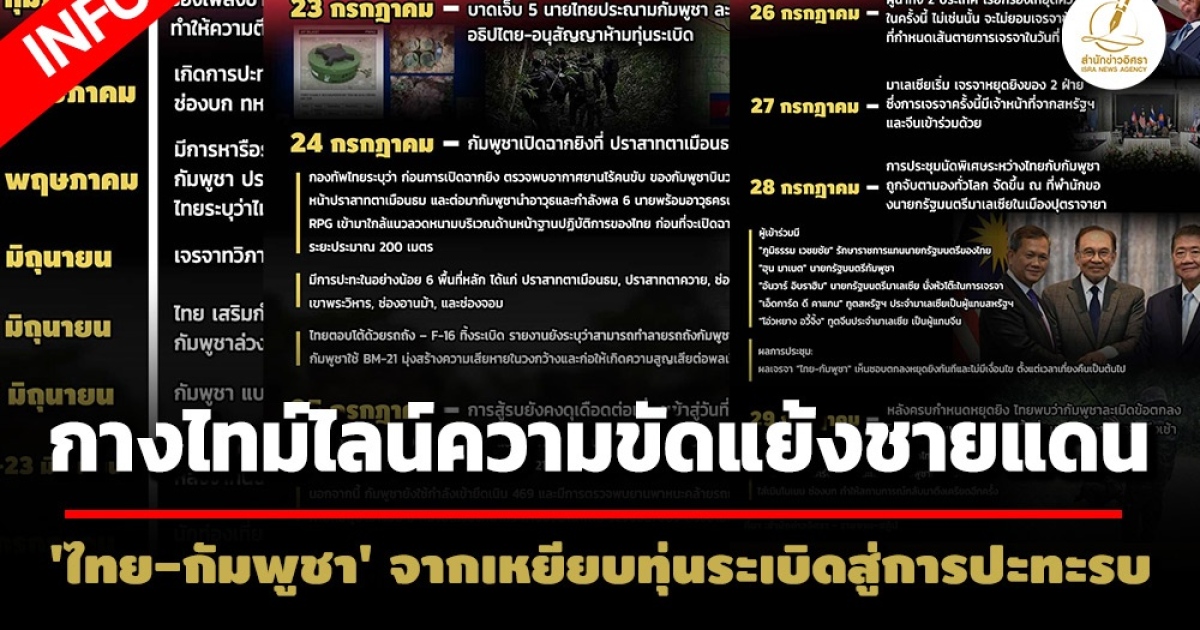 สถานการณ์ชายแดนระหว่างประเทศไทยและประเทศกัมพูชาได้ปะทุขึ้นสู่ระดับความตึงเครียดสูงสุดในรอบหลายปี ด้วยเหตุการณ์ปะทะด้วยอาวุธหนักที่ส่งผลกระทบอย่างรุนแรงต่อชีวิตและทรัพย์สินของทั้งสองฝ่าย สำนักข่าวอิศรา ลำดับเหตุการณ์สำคัญก่อนจะเกิดการปะทะล่าสุดในช่วงเดือนกรกฎาคม 2568 มีรายละเอียดดังนี้