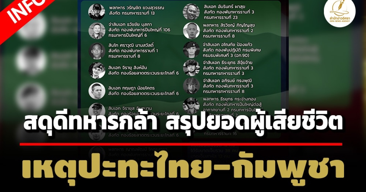 สำนักข่าวอิศรา สรุปสถานการณ์ผู้ได้รับผลกระทบจากการปะทะชายแดนไทย - กัมพูชา ซึ่งเกิดขึ้นตั้งแต่วันที่ 24 ก.ค. จนถึงปัจจุบัน สำหรับรายนามทหารกล้าพลีชีพระหว่างสู้รบแนวชายแดนไทย-กัมพูชา ปกป้องแผ่นดินไทย มีดังต่อไปนี้