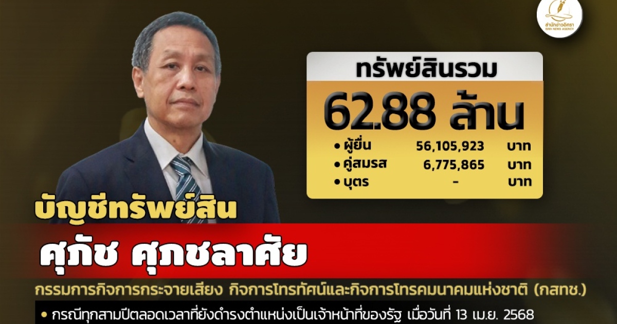 สำนักงานคณะกรรมการป้องกันและปราบปรามการทุจริตแห่งชาติ (ป.ป.ช.) เปิดเผยบัญชีแสดงทรัพย์สินและหนี้สินของ ศุภัช ศุภชลาศัย กรรมการกิจการกระจายเสียง กิจการโทรทัศน์และกิจการโทรคมนาคมแห่งชาติ (กสทช.) ทรัพย์สิน 62.88 ล. ประกอบด้วย เงินฝาก 18 บัญชี มูลค่ารวม 34.17 ล. ที่ดิน 4 แปลง มูลค่ารวม 10.02 ล. โรงเรือนและสิ่งปลูกสร้าง 4 หลัง มูลค่า 8.11 ล. ผู้ยื่น แจ้งมีรายได้ต่อปีโดยประมาณ 4.01 ล.