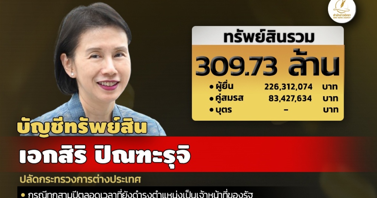 สำนักงานคณะกรรมการป้องกันและปราบปรามการทุจริตแห่งชาติ (ป.ป.ช.) เปิดเผยบัญชีแสดงทรัพย์สินและหนี้สินของ เอกสิริ ปิณฑะรุจ ปลัดกระทรวงการต่างประเทศ ทรัพย์สิน 309.73 ล. ประกอบด้วย เงินฝาก 44 บัญชี มูลค่า 28.83 ล. ที่ดิน 20 แปลง มูลค่า 110.97 ล. ผู้ยื่น แจ้งมีรายได้ต่อปีโดยประมาณ 2.04 ล.