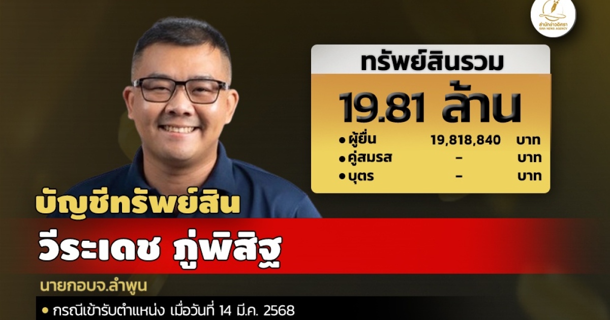 สำนักงานคณะกรรมการป้องกันและปราบปรามการทุจริตแห่งชาติ (ป.ป.ช.) เปิดเผยบัญชีแสดงทรัพย์สินและหนี้สินของ วีระเดช ภู่พิสิฐ นายกอบจ.ลำพูนฐ ทรัพย์สิน 19.81 ล. ประกอบด้วย เงินฝาก 13 บัญชี มูลค่า 1,640 บาท ที่ดิน 5 แปลง มูลค่า 4.15 ล. ผู้ยื่น แจ้งมีรายได้ต่อปีโดยประมาณ 1.76 ล.