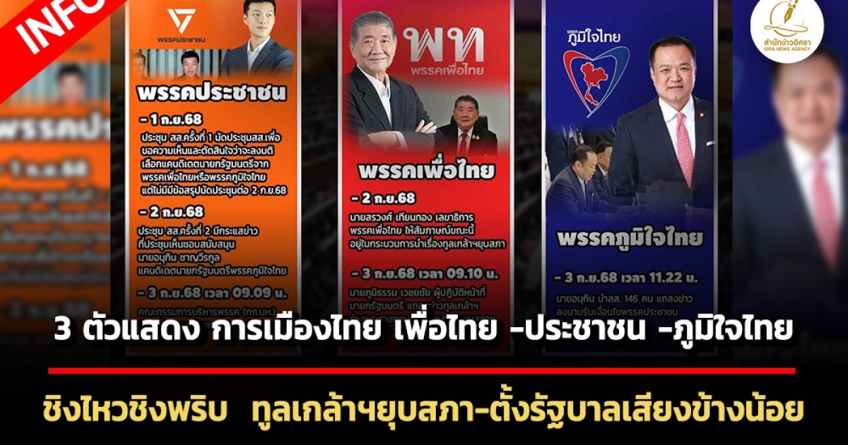 กลเกมชิงไหวชิงพริบของ 3 พรรคการเมืองใหญ่ ภายหลัง แพทองธาร ชินวัตร พ้นตำแหน่ง เนื่องจากคดีจริยธรรม กรณีเทฟสนทนาฮุนเซน : 3 ก.ย. 2568 ช่วงเช้า พรรคประชาชนแถลงมีมติสนับสนุนพรรคภูมิใจไทยเป็นแกนนำจัดตั้งรัฐบาล ต่อมา ภูมิธรรม เวชยชัย นายกฯรักษาการแห่งพรรคเพื่อไทย แถลงได้ยื่นยุบสภาฯไปก่อนแล้ว คล้อยหลังไม่นาน อนุทิน ชาญวีรกูล หัวหน้าพรรคภูมิใจไทย นำสส. 146 คน แถลงรับเงื่อนไขพรรคประชาชน จัดตั้งรัฐบาลเสียงข้างน้อย สำนักข่าวอิศราสรุปไทม์ไลน์ มารายงาน