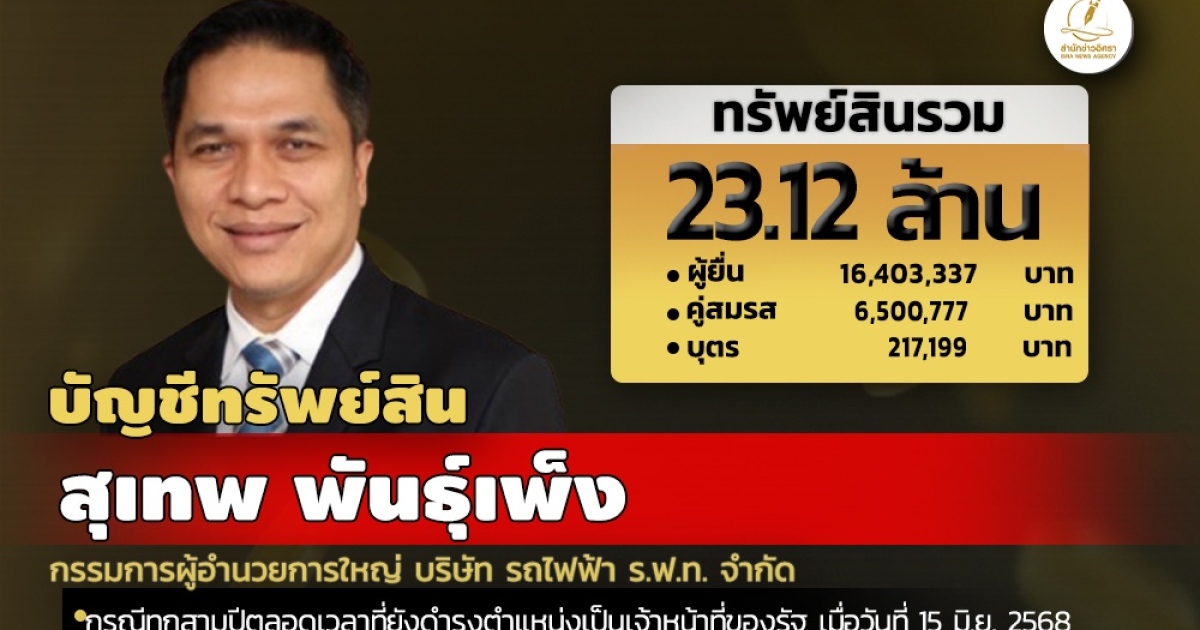 สำนักงานคณะกรรมการป้องกันและปราบปรามการทุจริตแห่งชาติ (ป.ป.ช.) เปิดเผยบัญชีแสดงทรัพย์สินและหนี้สินของ สุเทพ พันธุ์เพ็ง กรรมการผู้อำนวยการใหญ่ บริษัท รถไฟฟ้า ร.ฟ.ท. จำกัด ทรัพย์สิน 23.12 ล. ประกอบด้วย เงินฝาก 13 บัญชี มูลค่ารวม 1.64 ล้านบาท ที่ดิน 2 แปลง มูลค่า 3.41 ล. ผู้ยื่น แจ้งมีรายได้ต่อปีโดยประมาณ 4.52 ล.
