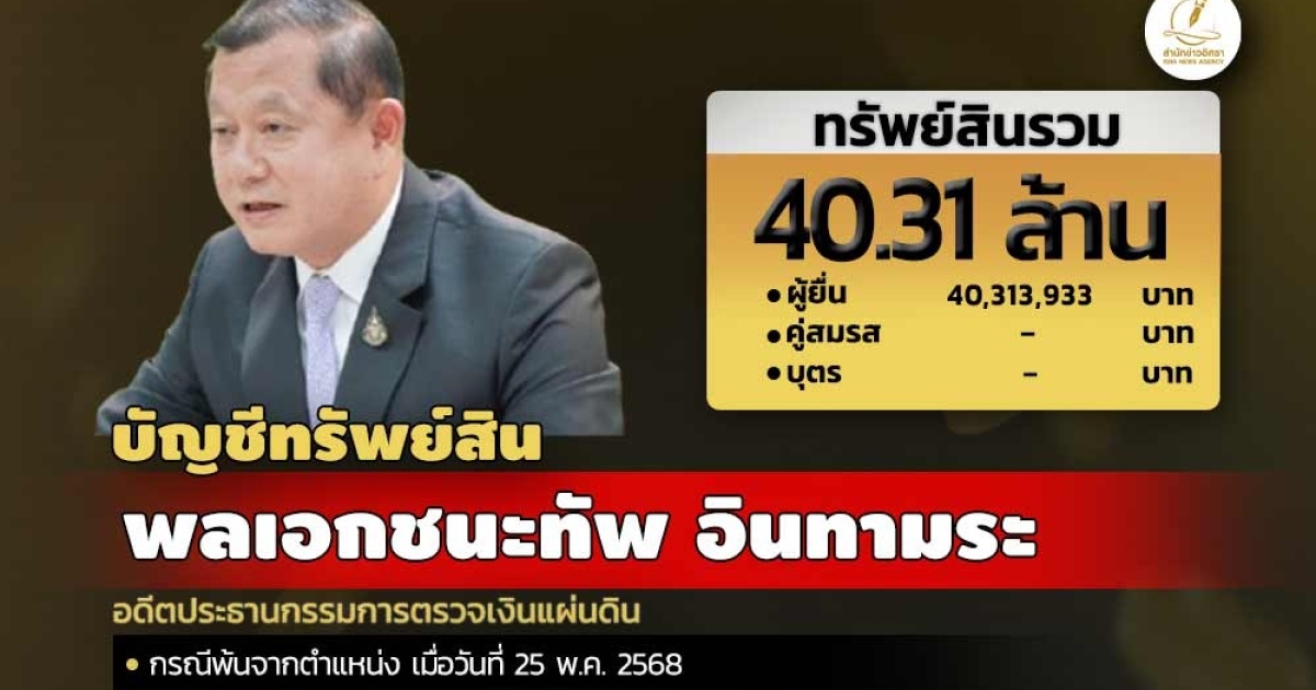 สำนักงานคณะกรรมการป้องกันและปราบปรามการทุจริตแห่งชาติ (ป.ป.ช.) เปิดเผยบัญชีแสดงทรัพย์สินและหนี้สินของ พลเอกชนะทัพ อินทามระ อดีตประธานกรรมการตรวจเงินแผ่นดิน ทรัพย์สิน 40.31 ล. ประกอบด้วย เงินฝาก 12 บัญชี มูลค่ารวม 16.68 ล. ที่ดิน 2 แปลง มูลค่า 3.32 ล. ผู้ยื่น แจ้งมีรายได้ต่อปีโดยประมาณ 3.85 ล.