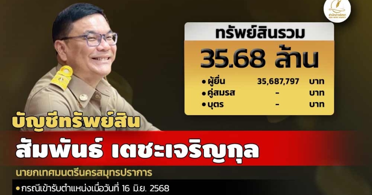 สำนักงานคณะกรรมการป้องกันและปราบปรามการทุจริตแห่งชาติ (ป.ป.ช.) เปิดเผยบัญชีแสดงทรัพย์สินและหนี้สินของ สัมพันธ์ เตชะเจริญกุล นายกเทศมนตรีนครสมุทรปราการ ทรัพย์สิน 35.68 ล. ประกอบด้วย เงินฝาก 8 บัญชี มูลค่ารวม 175,952 บาท ที่ดิน 3 แปลง มูลค่ารวม 11.93 ล. โรงเรือนและสิ่งปลูกสร้าง มูลค่า 13.30 ล. เป็นบ้าน 5 หลัง ทรัพย์สินอื่นๆ เช่น นาฬิกา พระเครื่อง ปืน มูลค่ารวม 5.98 ล.