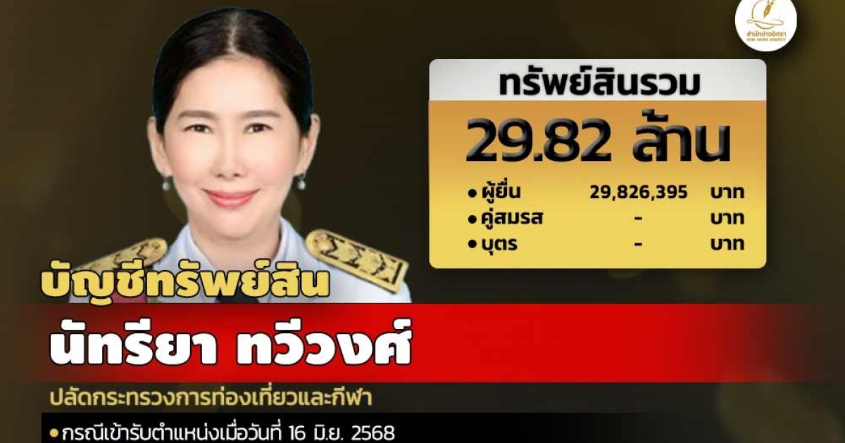สำนักงานคณะกรรมการป้องกันและปราบปรามการทุจริตแห่งชาติ (ป.ป.ช.) เปิดเผยบัญชีแสดงทรัพย์สินและหนี้สินของ นัทรียา ทวีวงศ์ ปลัดกระทรวงการท่องเที่ยวและกีฬา ทรัพย์สิน 29.82 ล. ประกอบด้วย เงินฝาก 4 บัญชี มูลค่ารวม 377,656 บาท ที่ดิน 1 แปลง มูลค่า 10 ล. โรงเรือนและสิ่งปลูกสร้าง มูลค่า 4 ล. เป็นบ้าน 1 หลัง ผู้ยื่นแจ้งมีรายได้ มูลค่ารวม 1.85 ล.