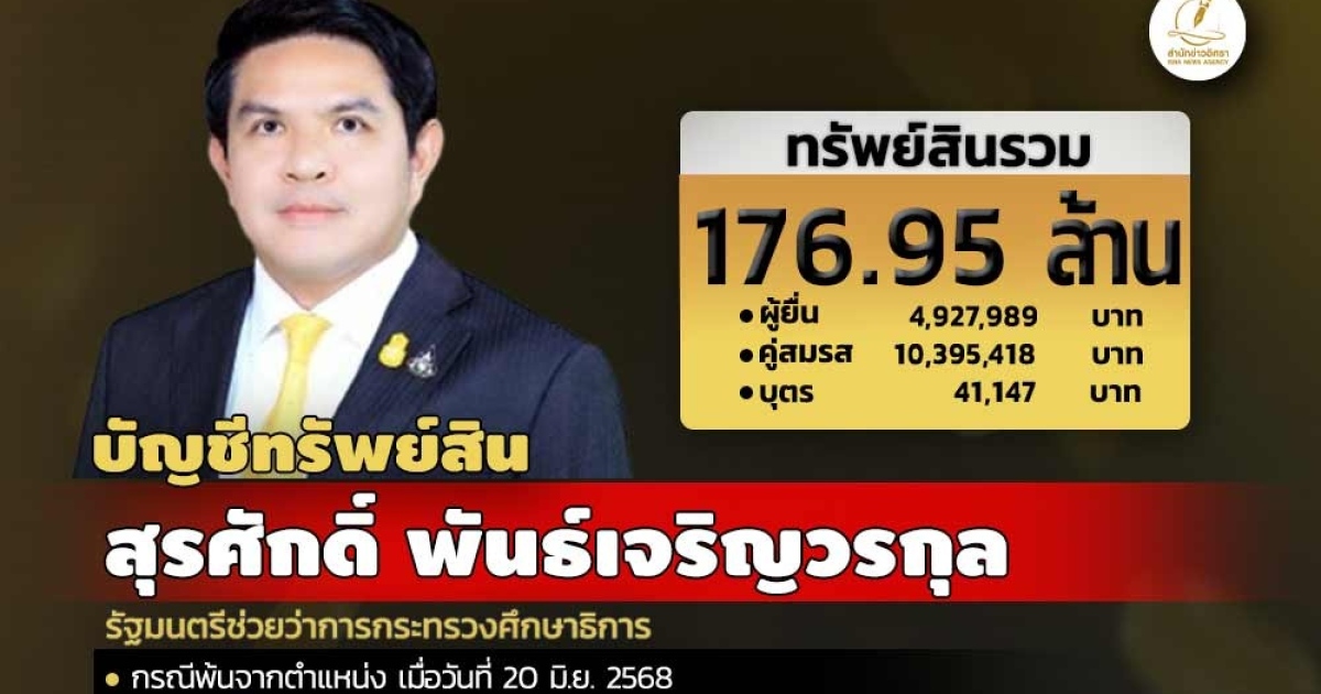 สำนักงานคณะกรรมการป้องกันและปราบปรามการทุจริตแห่งชาติ (ป.ป.ช.) เปิดเผยบัญชีแสดงทรัพย์สินและหนี้สินของ สุรศักดิ์ พันธ์เจริญวรกุ รัฐมนตรีช่วยว่าการกระทรวงศึกษาธิการ ทรัพย์สิน 176.95 ล. ประกอบด้วย เงินฝาก 15 บัญชี มูลค่ารวม 4.34 ล. ที่ดิน 21 แปลง มูลค่ารวม 142.80 ล. ผู้ยื่น แจ้งมีรายได้ต่อปี 1.36 ล.