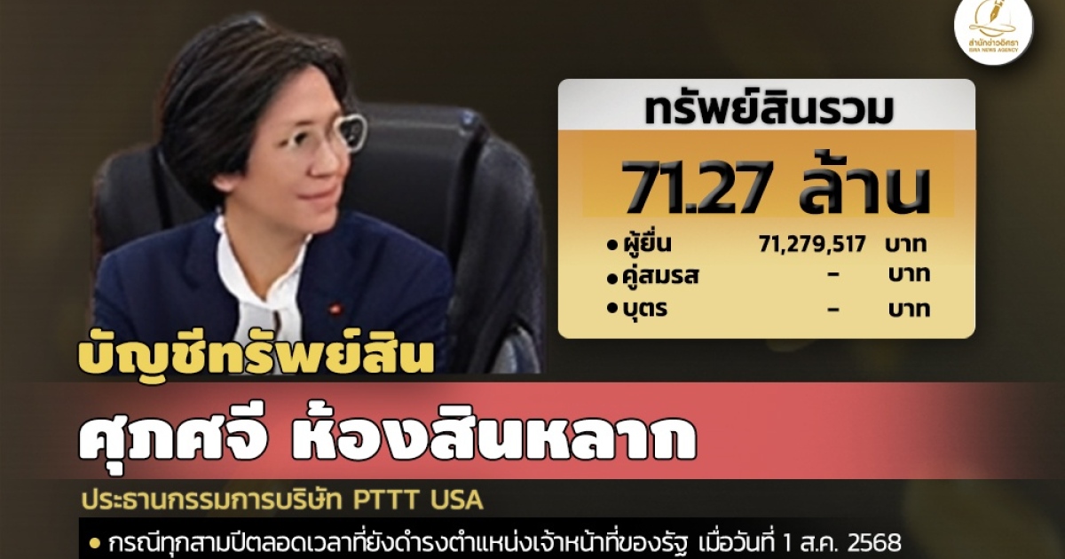 สำนักงานคณะกรรมการป้องกันและปราบปรามการทุจริตแห่งชาติ (ป.ป.ช.) เปิดเผยบัญชีแสดงทรัพย์สินและหนี้สินของ ศุภศจี ห้องสินหลาก ประธานกรรมการบริษัท PTTT USA ทรัพย์สิน 71.27 ล. ประกอบด้วย เงินฝาก 19 บัญชี มูลค่ารวม 42.07 ล. ผู้ยื่นแจ้งมีรายได้ต่อปี 7.40 ล.