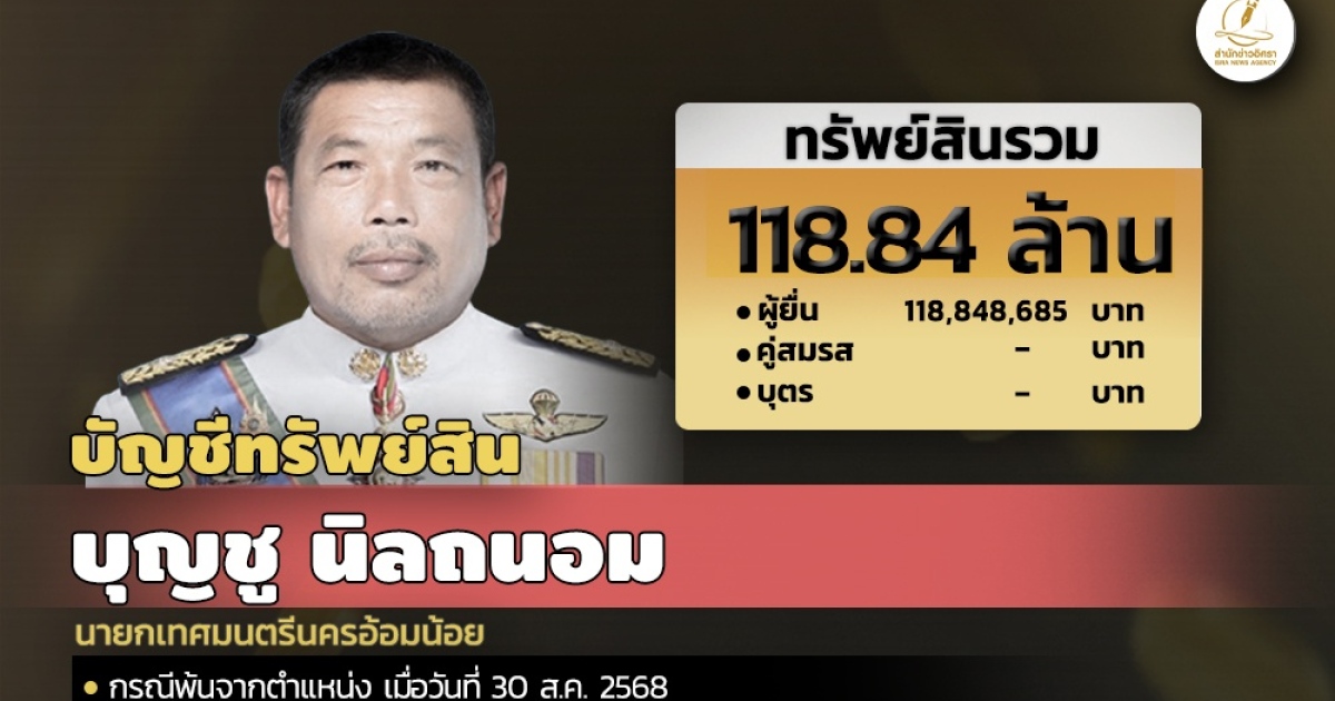 สำนักงานคณะกรรมการป้องกันและปราบปรามการทุจริตแห่งชาติ (ป.ป.ช.) เปิดเผยบัญชีแสดงทรัพย์สินและหนี้สินของ บุญชู นิลถนอม นายกเทศมนตรีนครอ้อมน้อย ทรัพย์สิน 118.84 ล. ประกอบด้วย เงินฝาก 2 บัญชี มูลค่ารวม 5.87 ล. ที่ดิน 4 แปลง มูลค่ารวม 105 ล. ผู้ยื่นแจ้งมีรายได้ต่อปี 1.22 ล.