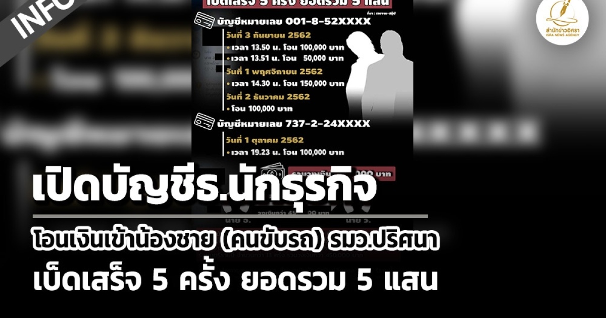 สำนักข่าวอิศรา (www.isranews.org) รายงานข้อมูลใหม่ไปแล้วว่า ในการติดตามเส้นทางเงินปริศนาที่โอนเข้ามาในบัญชีของนาย ว. น้องชายรัฐมนตรีปริศนารายนี้ ก่อนที่นาย ว. จะคอยนำเงินสดไปฝากเข้าบัญชีธนาคารผ่านตู้เงินฝากอัติโนมัติหน้าสาขาธนาคาร และเคาน์เตอร์ธนาคาร ยอดวงเงินที่ฝากมีทั้งหลักหมื่นหลักแสน บางครั้งก็มากถึงหลักล้านบาท เพื่อเข้าบัญชีรัฐมนตรีรายนี้อีกต่อหนึ่ง ล่าสุด ตรวจสอบยืนยันข้อมูลบัญชีธนาคารของ นาย อ. ที่โอนเงินหลายแสนบาท เข้าไปในบัญชีธนาคารของ นาย ว. น้องชายรัฐมนตรี จำนวน 2 บัญชี ดังนี้