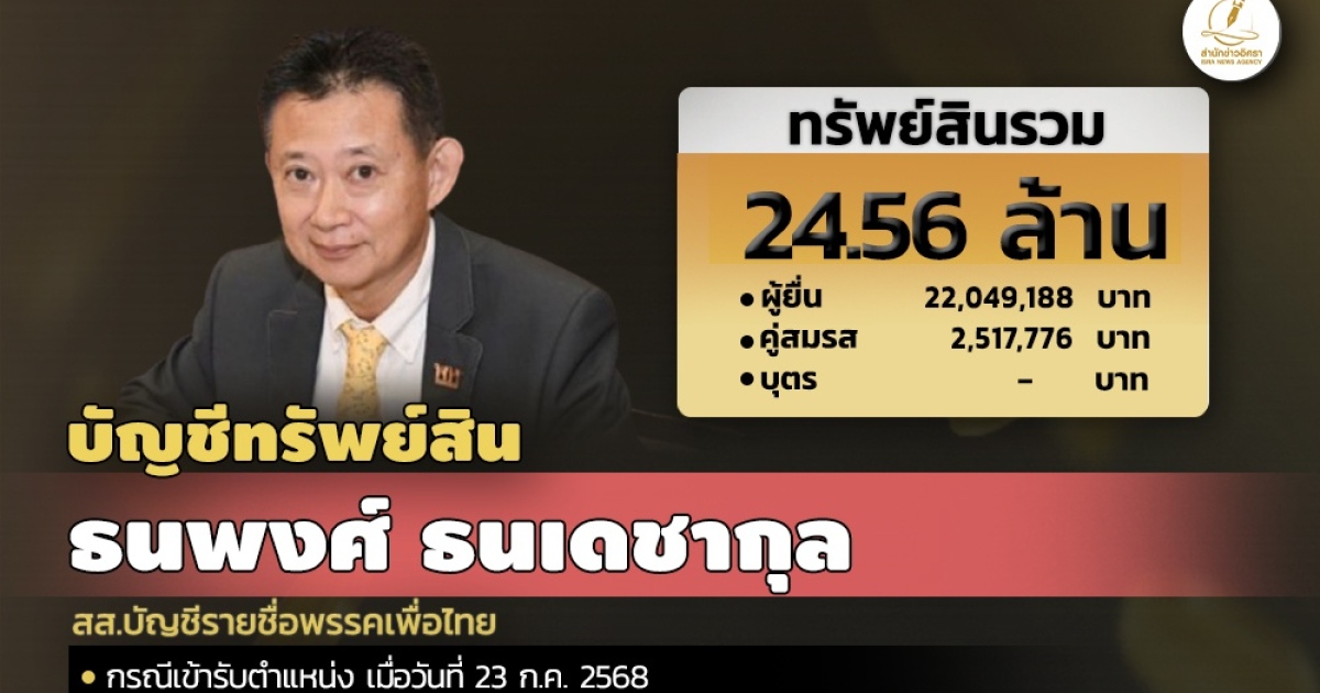 สำนักงานคณะกรรมการป้องกันและปราบปรามการทุจริตแห่งชาติ (ป.ป.ช.) เปิดเผยบัญชีแสดงทรัพย์สินและหนี้สินของ ธนพงศ์ ธนเดชากุล สส.บัญชีรายชื่อพรรคเพื่อไทย ทรัพย์สิน 24.56 ล. ประกอบด้วย เงินฝาก 7 บัญชี มูลค่ารวม 2.26 ล. ผู้ยื่นแจ้งมีรายได้ต่อปี 1.26 ล.