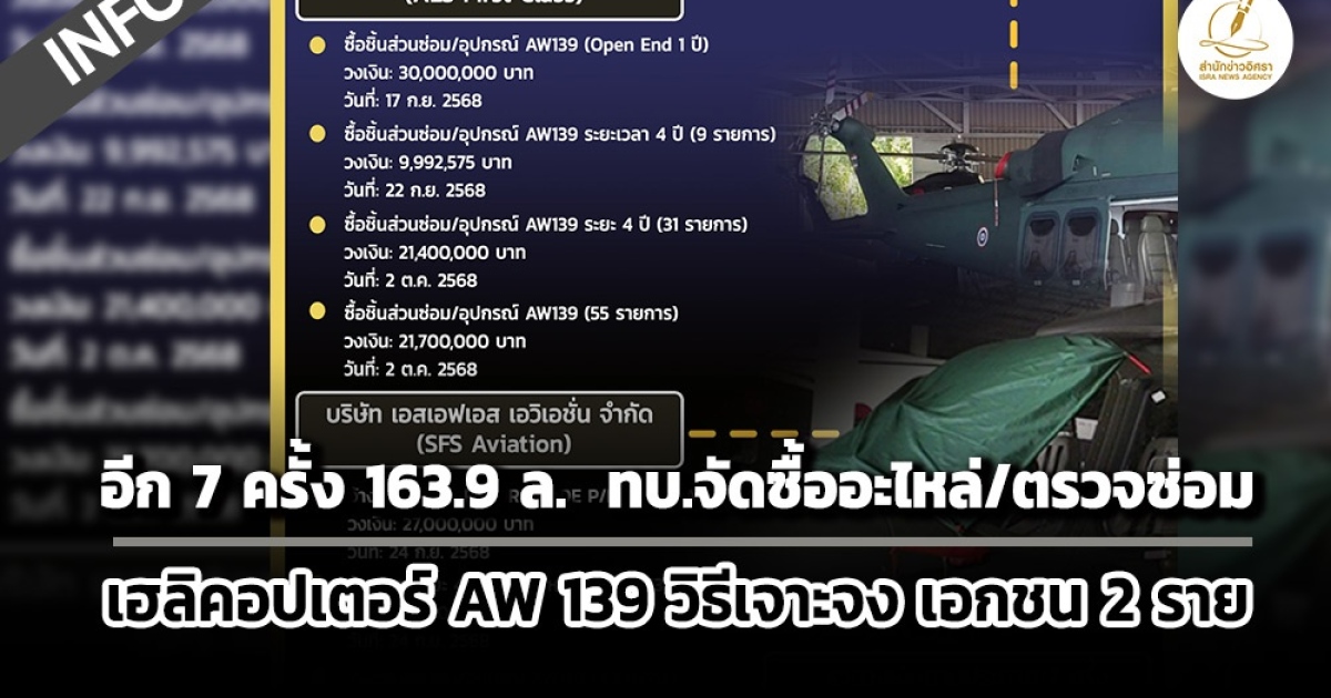 ล่าสุด สำนักข่าวอิศรา รายงานว่า เมื่อเดือน ก.ย.- ต.ค.2568 ที่ผ่านมา กองทัพบกโดยกรมขนส่งทหารบกได้ประกาศผู้ชนะการเสนอราคา การซื้อชิ้นส่วนซ่อมและอุปกรณ์ เฮลิคอปเตอร์ใช้งานทั่วไป แบบ 139 หรือ AW 139 และ การจ้างตรวจตามระยะเวลา 4 ปี เฮลิคอปเตอร์ แบบ 139 โดยวิธีเฉพาะเจาะจง เอกชน 2 ราย ได้แก่ บริษัท เอ แอล เอส เฟิร์สคลาส จำกัด และ บริษัท เอสเอฟเอส เอวิเอชั่น จำกัด อย่างน้อย 7 ครั้ง ดังนี้