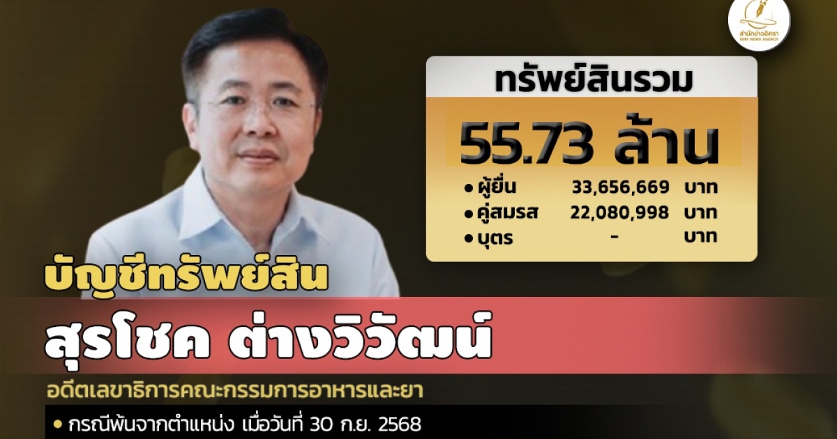 สำนักงานคณะกรรมการป้องกันและปราบปรามการทุจริตแห่งชาติ (ป.ป.ช.) เปิดเผยบัญชีแสดงทรัพย์สินและหนี้สินของ สุรโชค ต่างวิวัฒน์ อดีตเลขาธิการคณะกรรมการอาหารและยา ทรัพย์สิน 55.73 ล. ประกอบด้วย เงินฝาก 22 บัญชี มูลค่ารวม 6.88 ล. ที่ดิน 8 แปลง มูลค่า 9.07 ล. โรงเรือนและสิ่งปลูกสร้าง 5 หลัง มูลค่า 12.69 ล. ผู้ยื่น แจ้งมีรายได้ต่อปีโดยประมาณ 2.46 ล.