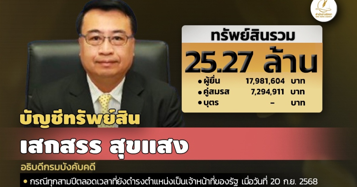 สำนักงานคณะกรรมการป้องกันและปราบปรามการทุจริตแห่งชาติ (ป.ป.ช.) เปิดเผยบัญชีแสดงทรัพย์สินและหนี้สินของ เสกสรร สุขแสง อธิบดีกรมบังคับคดี ทรัพย์สิน 25.27 ล. ประกอบด้วย เงินฝาก 4 บัญชี มูลค่ารวม 276,215 บาท ที่ดิน 7 แปลง มูลค่า 15.10 ล. โรงเรือนและสิ่งปลูกสร้าง 5 หลัง มูลค่า 3 ล. นายฉัตรชัย แจ้งมีรายได้ต่อปีโดยประมาณ 1.99 ล.