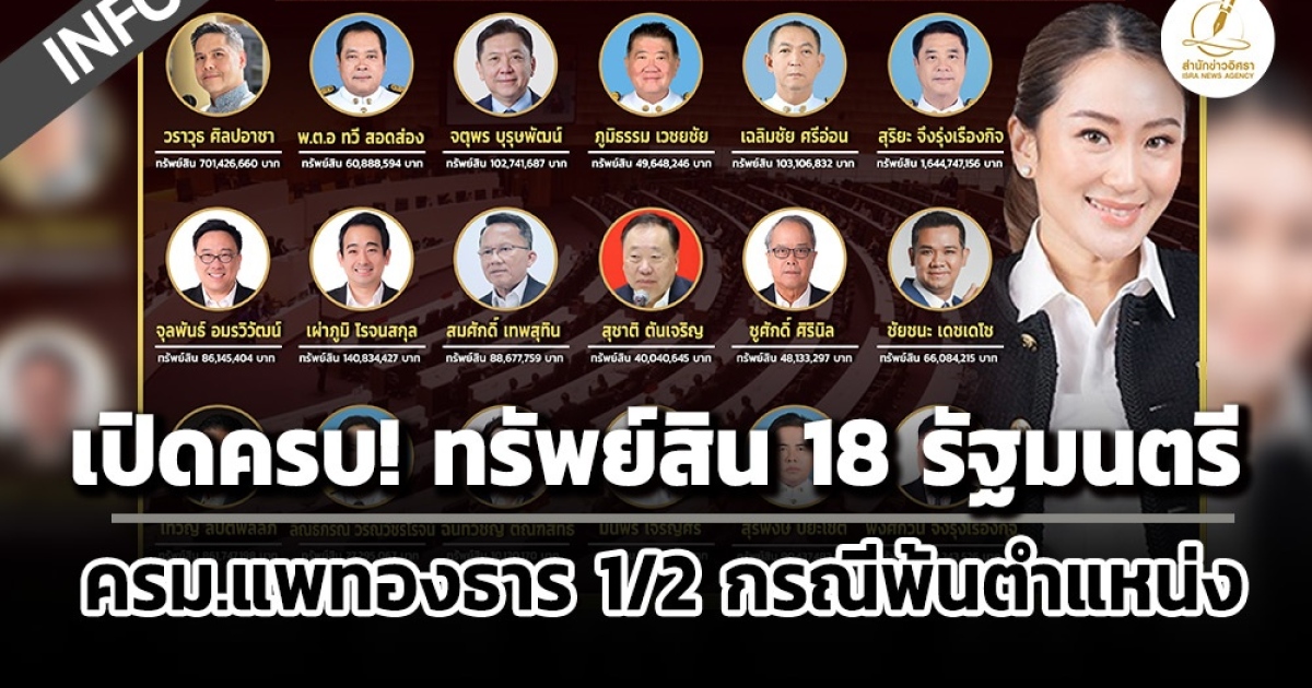 ป.ป.ช. เปิดทรัพย์สินรัฐมนตรี ครม.แพทองธาร 1/2 กรณีพ้นตำแหน่ง จำนวน 18 ราย ดังนี้