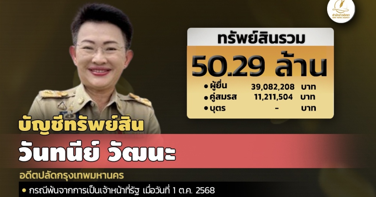 สำนักงานคณะกรรมการป้องกันและปราบปรามการทุจริตแห่งชาติ (ป.ป.ช.) เปิดเผยบัญชีแสดงทรัพย์สินและหนี้สินของ วันทนีย์ วัฒนะ อดีตปลัดกรุงเทพมหานคร ทรัพย์สิน 50.29 ล. ประกอบด้วย เงินฝาก 13 บัญชี มูลค่ารวม 15.09 ล. ที่ดิน 15 แปลง มูลค่า 19.25 ล. โรงเรือนและสิ่งปลูกสร้าง 4 หลัง มูลค่า 2.40 ล. ผู้ยื่น แจ้งมีรายได้ต่อปีโดยประมาณ 1.43 ล.