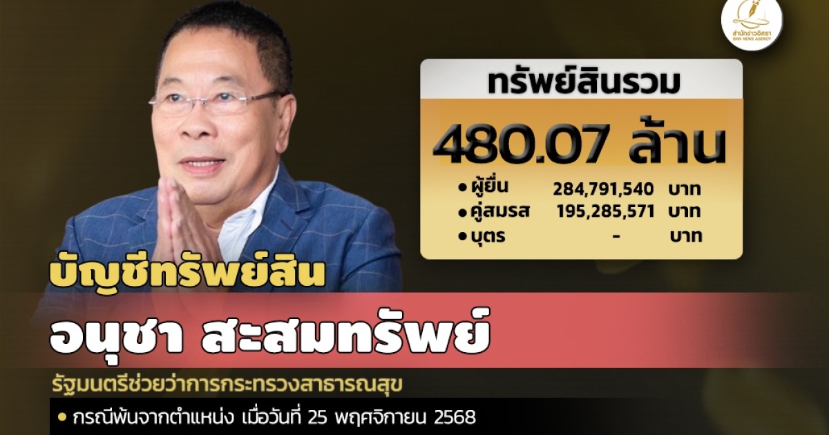 สำนักงานคณะกรรมการป้องกันและปราบปรามการทุจริตแห่งชาติ (ป.ป.ช.) เปิดเผยบัญชีแสดงทรัพย์สินและหนี้สินของ อนุชา สะสมทรัพย์รัฐมนตรีช่วยว่าการกระทรวงสาธารณสุข ทรัพย์สิน 480.07 ล. ประกอบด้วย เงินฝาก 19 บัญชี มูลค่ารวม 132.51 ล. ที่ดิน 6 แปลง มูลค่า 26.56 ล. โรงเรือนและสิ่งปลูกสร้าง 3 หลัง มูลค่า 30 ล. ผู้ยื่น แจ้งมีรายได้ต่อปีโดยประมาณ 72.07 ล.
