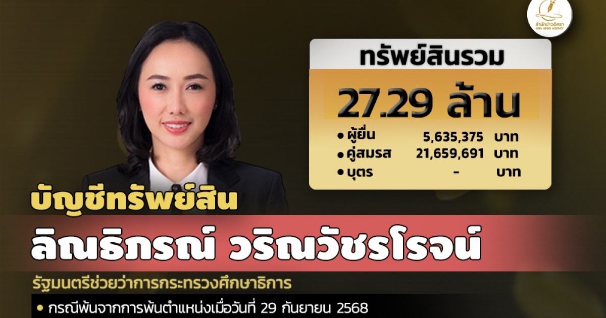 สำนักงานคณะกรรมการป้องกันและปราบปรามการทุจริตแห่งชาติ (ป.ป.ช.) เปิดเผยบัญชีแสดงทรัพย์สินและหนี้สินของ ลิณธิภรณ์ วริณวัชรโรจน์ รัฐมนตรีช่วยว่าการกระทรวงศึกษาธิการ ทรัพย์สิน 27.29 ล. ประกอบด้วย เงินฝาก 16 บัญชี มูลค่ารวม 409,230 บาท ที่ดิน 3 แปลง มูลค่า 3.87 ล. โรงเรือนและสิ่งปลูกสร้าง 4 หลัง มูลค่า 10.50 ล. ผู้ยื่น แจ้งมีรายได้ต่อปีโดยประมาณ 1.36 ล.