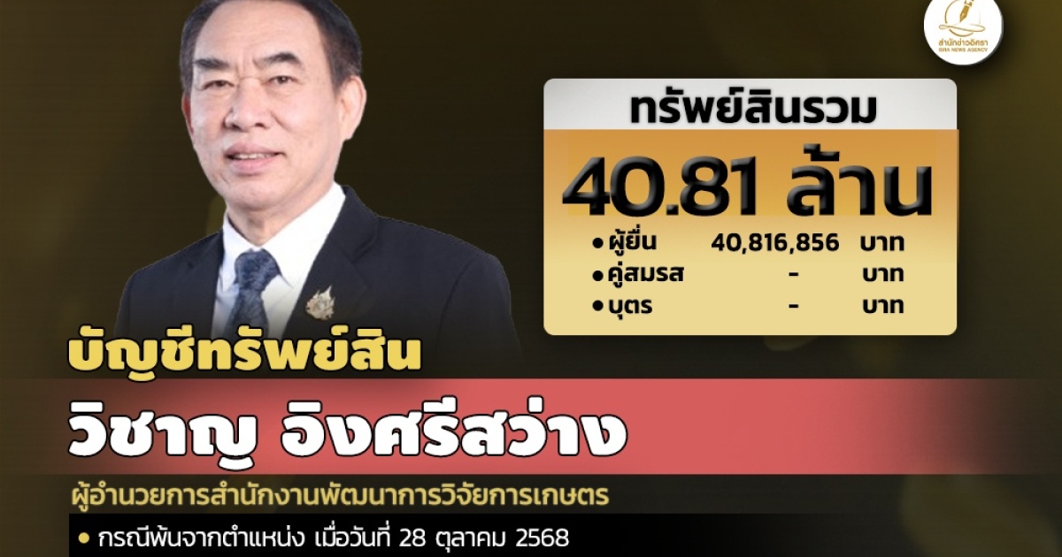 สำนักงานคณะกรรมการป้องกันและปราบปรามการทุจริตแห่งชาติ (ป.ป.ช.) เปิดเผยบัญชีแสดงทรัพย์สินและหนี้สินของ วิชาญ อิงศรีสว่าง ผู้อำนวยการสำนักงานพัฒนาการวิจัยการเกษตร ทรัพย์สิน 40.81 ล. ประกอบด้วย เงินฝาก 12 บัญชี มูลค่ารวม 5.28 ล. ที่ดิน 3 แปลง มูลค่า 21.28 ล. ผู้ยื่น แจ้งมีรายได้ต่อปีโดยประมาณ 4.43 ล.