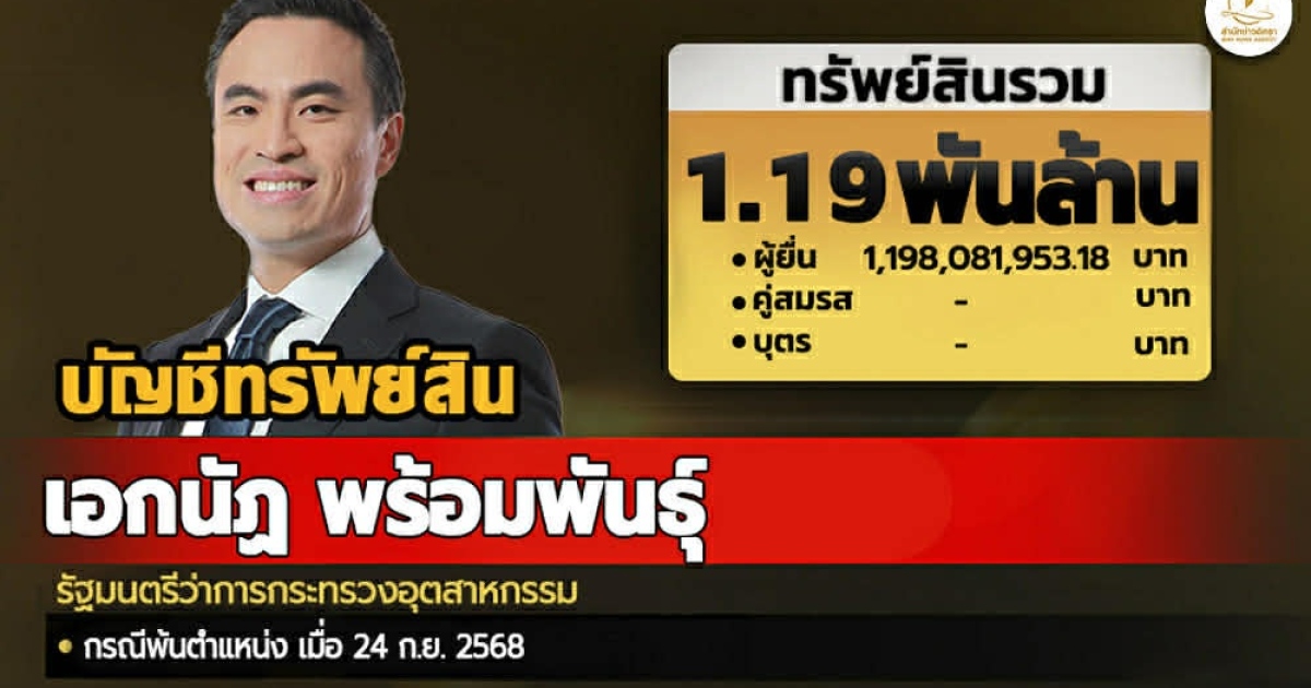 สำนักข่าวอิศรา www.isranews.org : อินโฟกราฟิก บัญชีแสดงรายการทรัพย์สินและหนี้สิน นายเอกนัฏ พร้อมพันธุ์ กรณีพ้นจากตำแหน่ง รัฐมนตรีว่าการกระทรวงอุตสาหกรรม วันที่ 24 กันยายน 2568 ในคณะรัฐมนตรีแพทองธาร ชินวัตร สถานะโสด ทรัพย์สินทั้งสิ้น 1,198,081,953 บาท หนี้สิน 2,367,444 บาท อาทิ เงินลงทุน 4 บริษัท รวม 7,930,000 บาท เงินให้กู้ยืม 327,811,777 บาท ที่ดิน 119 แปลง 746,253,007 บาท โรงเรือนและสิ่งปลูกสร้าง 107,618,540 บาท มีหนี้สิน 2,367,444 บาท