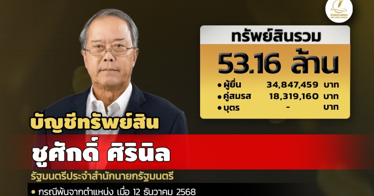 สำนักงานคณะกรรมการป้องกันและปราบปรามการทุจริตแห่งชาติ (ป.ป.ช.) เปิดเผยบัญชีแสดงรายการทรัพย์สินและหนี้สิน นายชูศักดิ์ ศิรินิล กรณีพ้น สส.-รมต.สำนักนายกฯ รัฐบาลแพทองธาร ล่าสุด 53.1 ล. เพิ่มขึ้นจากช่วงพ้นตำแหน่งรัฐมนตรี 2 เดือนเศษ กว่า 5 ล้าน ส่วนใหญ่เป็นมูลค่าที่ดิน-บ้านพักที่สูงขึ้น เจ้าตัวแจ้งครอบครองทองคำหนัก 7 บาท พระเครื่อง-นาฬิกาหรูเพียบ ทั้งคู่แจ้งไร้หนี้สิน